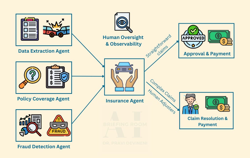 When a claim is submitted, an agent orchestrates multiple AI systems in sequence—one extracts data from forms, another analyzes photos, a third checks policy coverage, and a fraud module compares the case against historical patterns.