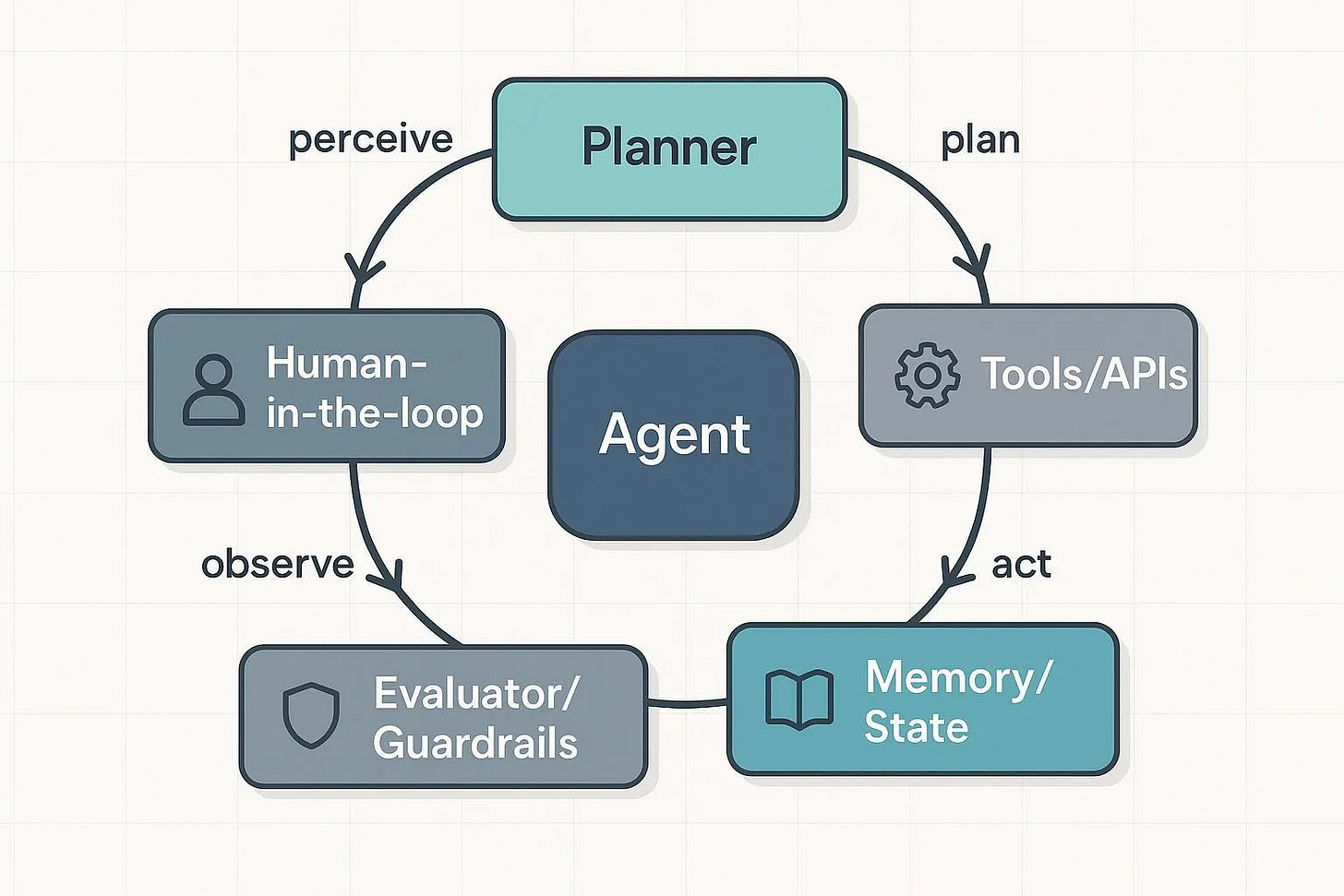 Each loop—observe → perceive → plan → act—updates the environment and reshapes every agent’s decision. The system’s behavior doesn’t come from one agent’s intelligence but from how all agents pursue their goals within shared boundaries.