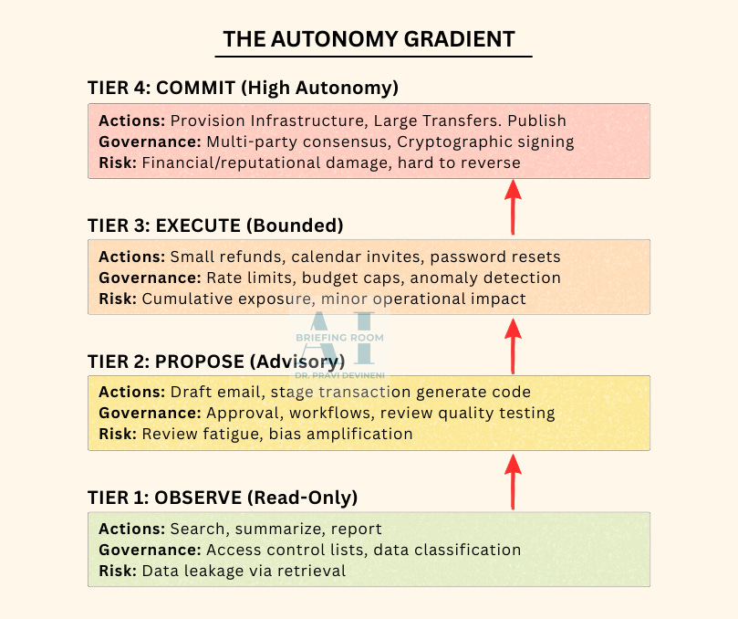 Agent authority operates on a gradient. This post structures that gradient across four practical tiers — Observe, Propose, Execute, Commit — each with distinct governance requirements.