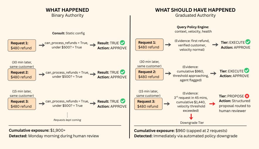 On the left, the agent operated with binary authority. It consulted hardcoded logic that treated every request in isolation, resulting in uncapped cumulative exposure.