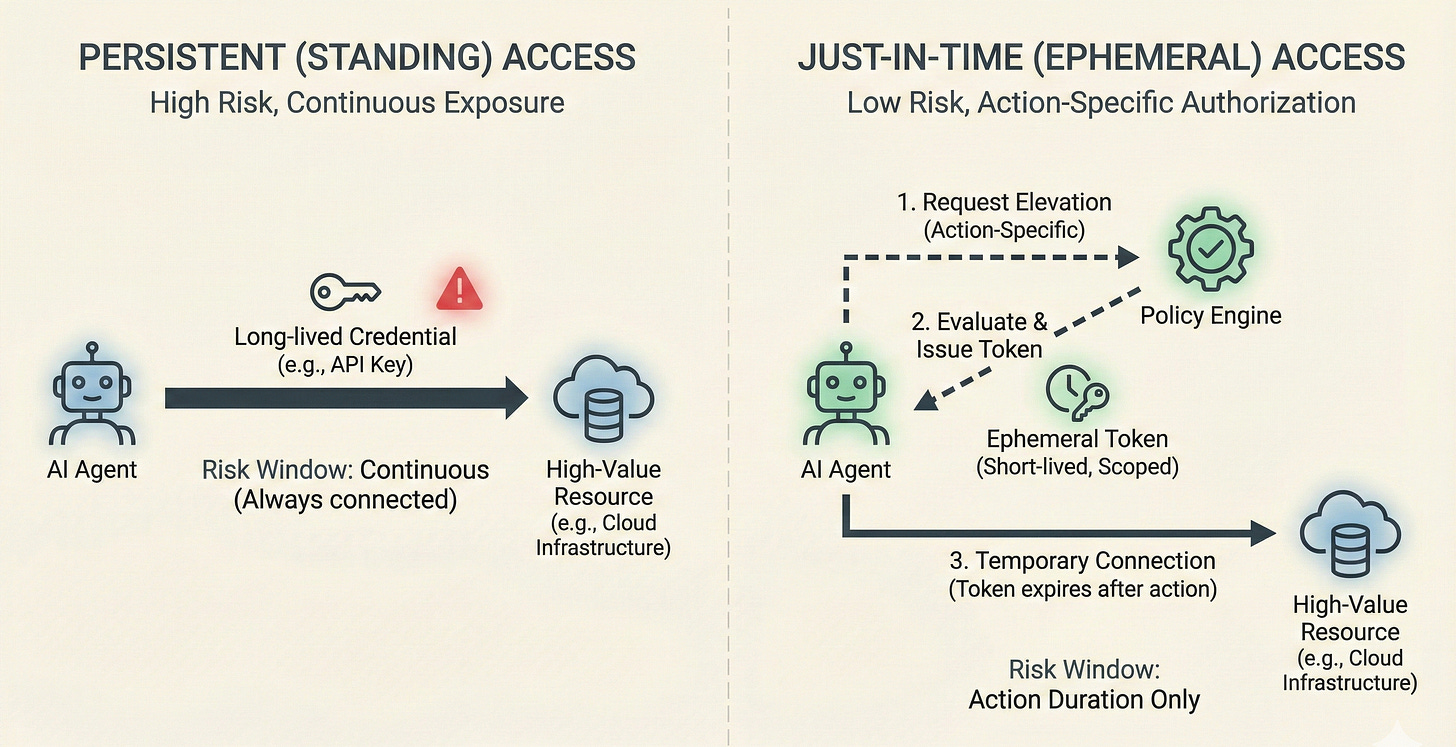 Non-human identities with persistent permissions accumulate risk. Ephemeral elevation limits the blast radius of any single compromise to the duration of that short authorization window. This is exactly how governance via engineering results in fundamentally secure AI systems.