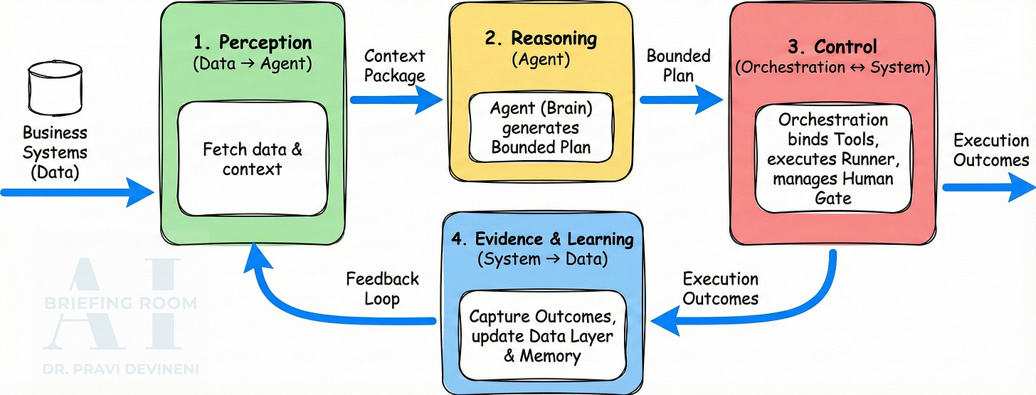 Perception → Reasoning → Orchestration is agency in practice: Data perceives the world, the Agent decides what should happen, and Orchestration carries it out under the right guardrails.